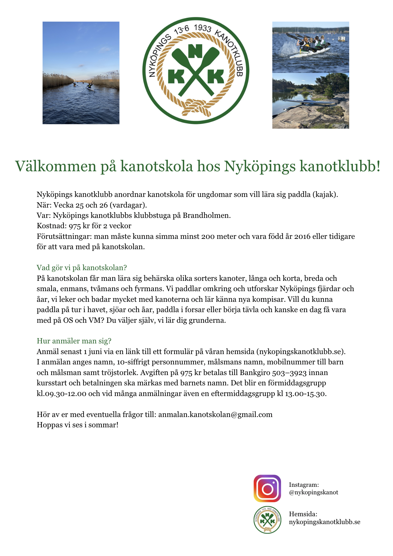 Nyköpings kanotklubb har en lång tradition av att arrangera kanotskola under sommarlovet. Årets kanotskola kommer att äga rum under vecka 25 och 26. Läs mer och anmäl er enligt instruktioner nedan. Hoppas att vi ses i sommar! ☀️
